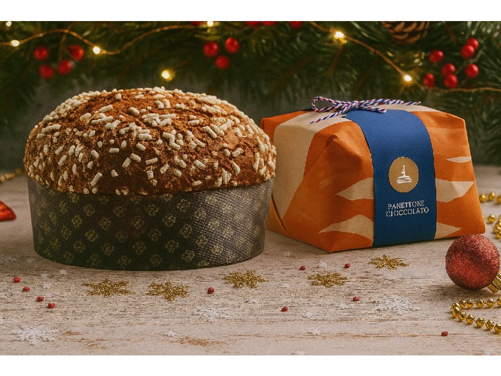 Objevte luxusní italský panettone od Fiasconaro, plný čokoládových kousků a pokrytý jemnou čokoládovou glazurou.