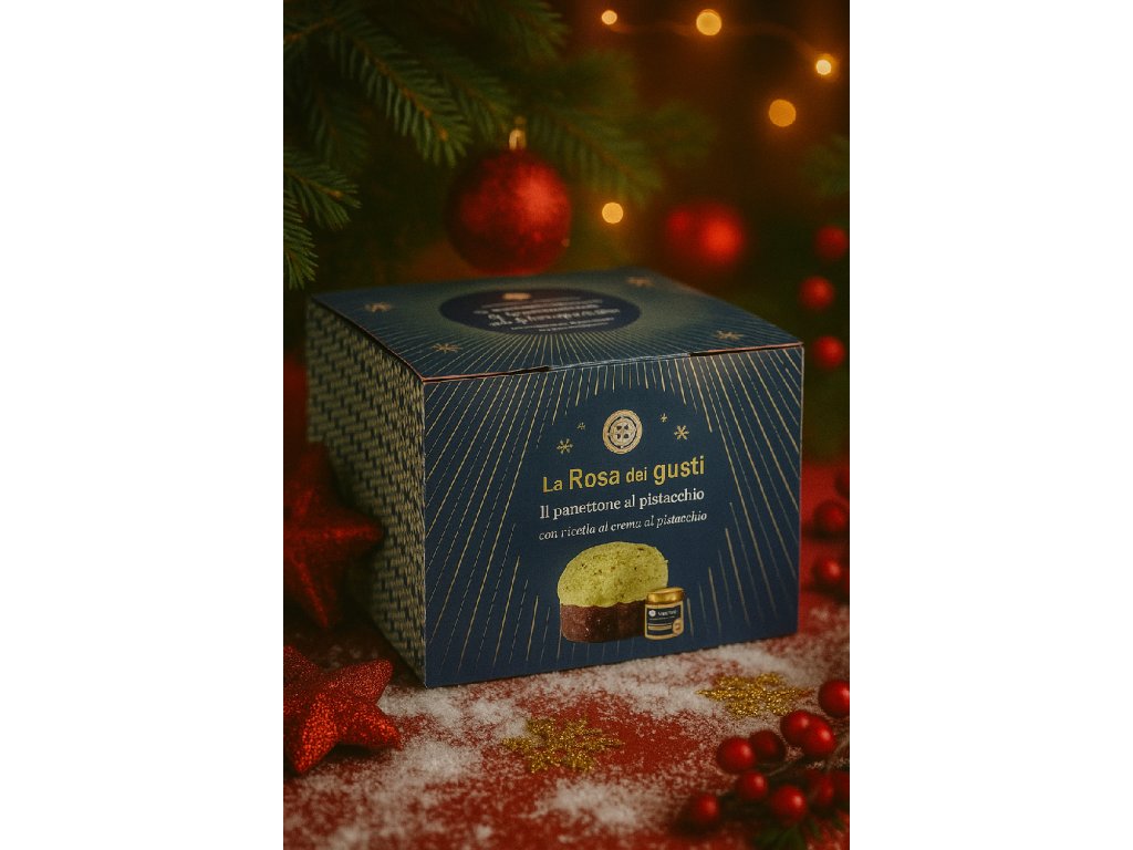Luxusní pistáciové panettone 930 g s bohatou pistáciovou polevou.